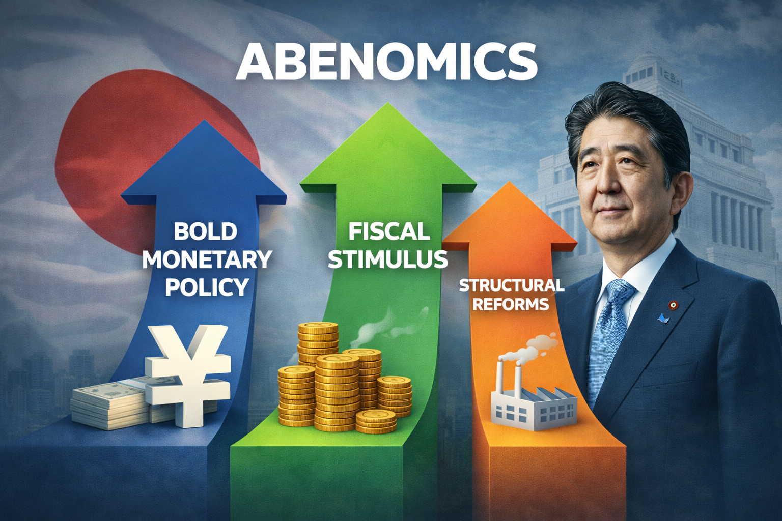 아베 신조 전 일본 총리가 '잃어버린 20년'이라 불리는 일본의 장기 불황과 디플레이션(물가 하락)을 끝내겠다며 내놓은 경제 정책입니다. 핵심은 "돈을 엄청나게 풀어서 물가를 억지로라도 올리자"는 것이었죠.